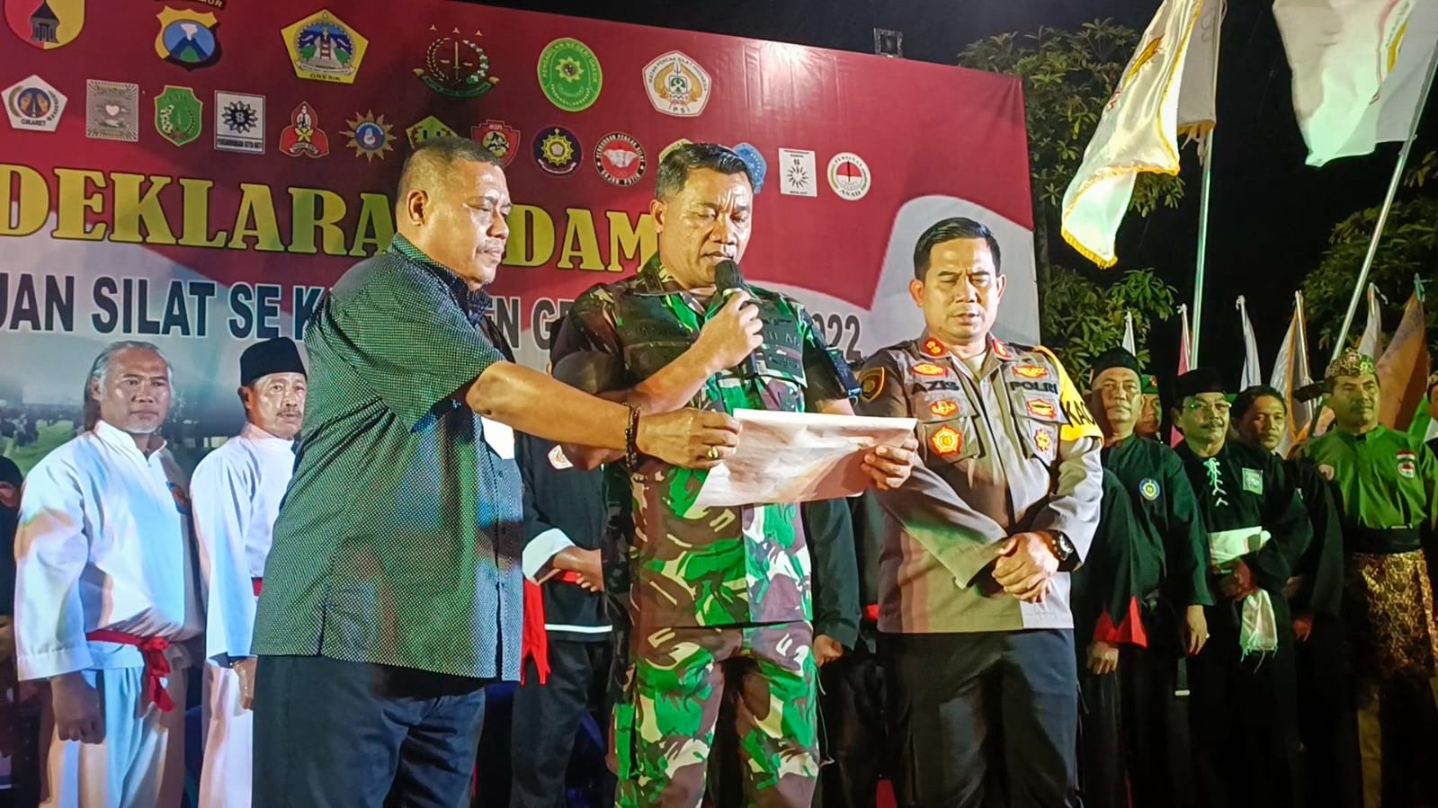 Turut hadir Dalam kegiatan Deklarasi Damai, Kapolres Gresik, Asisten 1 Pemkab Gresik, Ketua DPRD Kab. Gresik, Kajari Kab. Gresik, Ketua PN Kab. Gresik, Ketua umum KONI kab. Gresik, Kepala Dispatekrafbudpora, Kasatpol PP kab. Gresik, Kepala Bakesbangpol Kab. Gresik, Ketua MUI Gresik, Para Danramil Jajaran Kodim 0817/Gresik, serta Ketua cabang maupun ranting perguruan silat Se-Kabupaten Gresik. (Anl)
