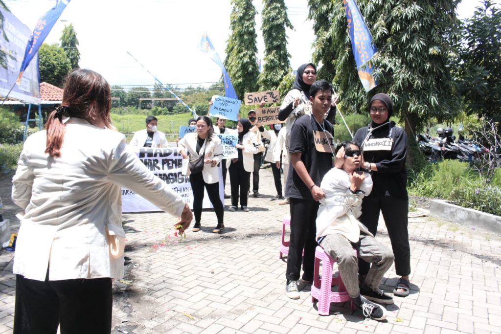 Mereka menggelar aksi teatrikal, memprotes kebijakan kampus yang memberikan sanksi berupa pengguguran nilai pada 2 mahasiswa yang tanpa izin merekam pembicaraan dengan Ketua.