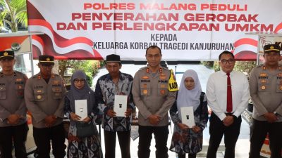 MALANG |nusantarajayanews.id – Kapolres Malang, AKBP Putu Kholis Aryana, kembali menunjukkan komitmennya dalam memberikan dukungan kepada keluarga korban yang terdampak Tragedi Kanjuruhan. Kepedulian diwujudkan dengan penyerahan bantuan modal dan sarana pengembangan Usaha Mikro, Kecil, dan Menengah (UMKM) kepada tiga keluarga di Mapolres Malang, Rabu (7/2/2024).