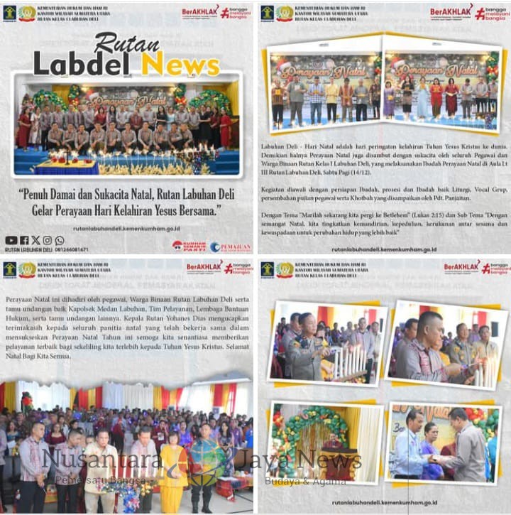 Demikian halnya Perayaan Natal juga disambut dengan sukacita oleh seluruh Pegawai dan Warga Binaan Rutan Kelas I Labuhan Deli, yang melaksanakan Ibadah Perayaan Natal di Aula Lt III Rutan Labuhan Deli, Sabtu Pagi (14/12/2024).