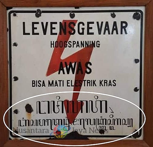 Pegiat sejarah klasik Tepe Wijoyo memperhatikan salah satu dari produk beraksara Jawa, yang masih bisa ditemui di beberapa tempat di Surabaya. Yaitu plakard peringatan atas bahaya listrik.