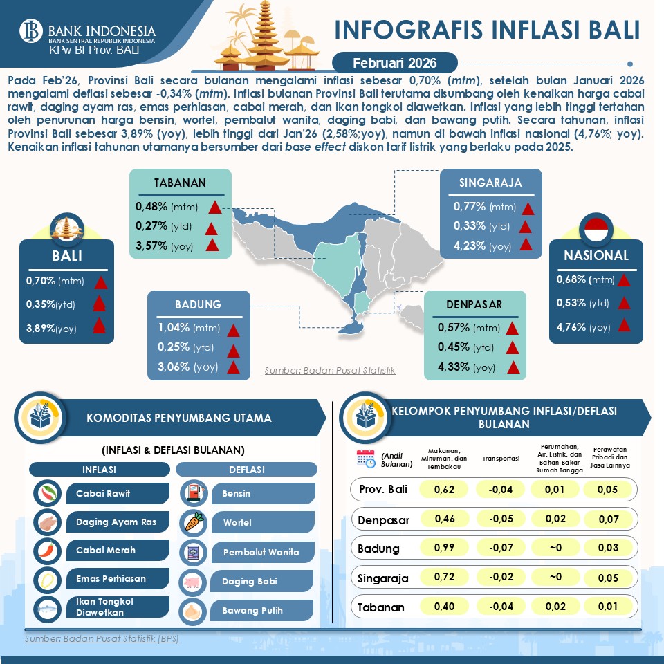 Kualitas kredit perbankan di Bali tetap terjaga terlihat dari rasio kredit bermasalah atau Non Performing Loan (NPL) gross sebesar 3,14 persen, sementara NPL net berada di posisi 2,18 persen. Walaupun sedikit meningkat dibandingkan posisi Desember 2024, namun masih jauh di bawah threshold.