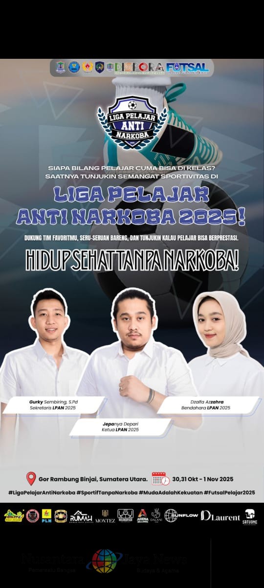 BINJAI, //Nusantara Jaya News -Dalam upaya membentengi generasi muda dari bahaya narkoba sekaligus menumbuhkan semangat berprestasi di bidang olahraga, Liga Pelajar Anti Narkoba Regional Sumatera Utara dan Aceh resmi digelar. Kegiatan ini digagas langsung oleh Founder Liga Pelajar Anti Narkoba, Gurky Sembiring, bersama Ketua Panitia, Jepanya Depari.