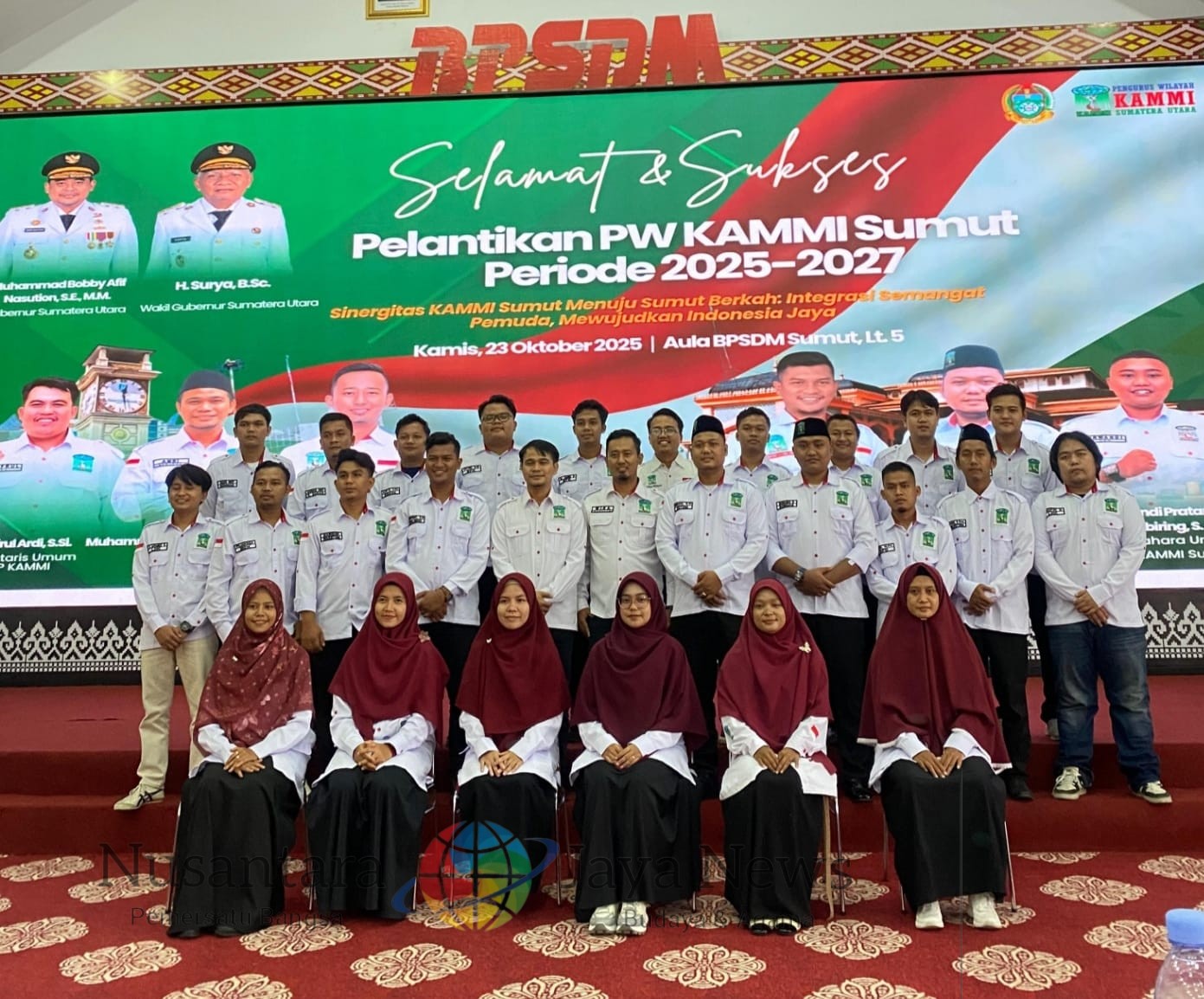 Medan | Nusantara Jaya News – Pengurus Wilayah Kesatuan Aksi Mahasiswa Muslim Indonesia (KAMMI) Sumatera Utara resmi dilantik oleh Ketua Umum PP KAMMI Muhammad Amri Akbar, S.T., M.E dan didampingi Bendum PP KAMMI Wira Putra, S.S dengan jajaran Pengurus Baru untuk Periode 2025–2027 pada Kamis (23/10/2025) di Balai Pengembangan Sumber Daya Manusia (BPSDM) Pemerintah Provinsi Sumatera Utara.