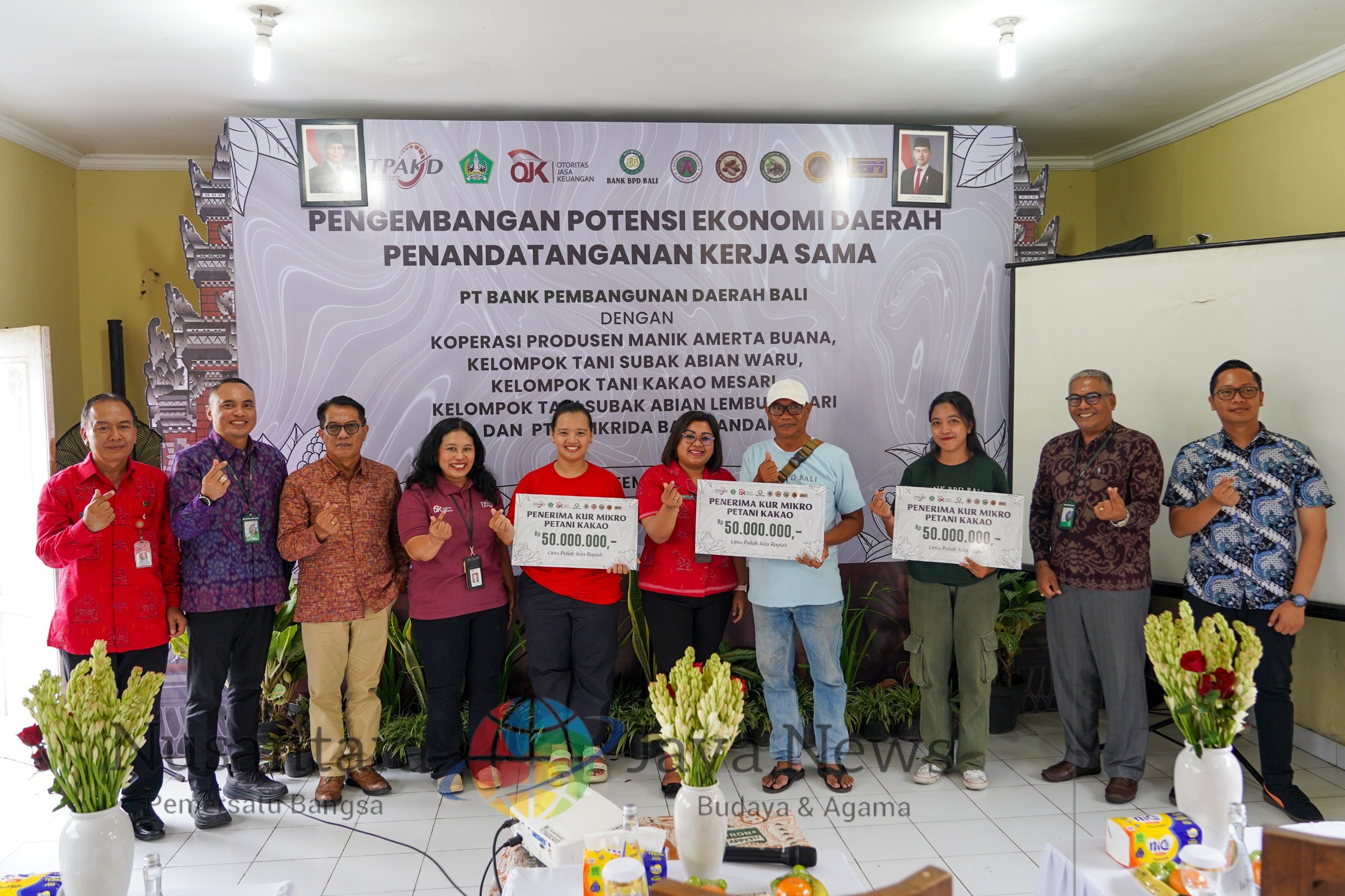 Penandatanganan kerja sama pengembangan kakao digelar antara PT Bank Pembangunan Daerah (BPD) Bali, PT Jamkrida Bali Mandara, Koperasi Manik Amerta Buana sebagai off taker serta Kelompok Tani Kakao Mesari, Lembung Sari, dan Subak Abian Waru bertempat di Balai Pelatihan Pertanian Kabupaten Tabanan, Selasa (30/9).