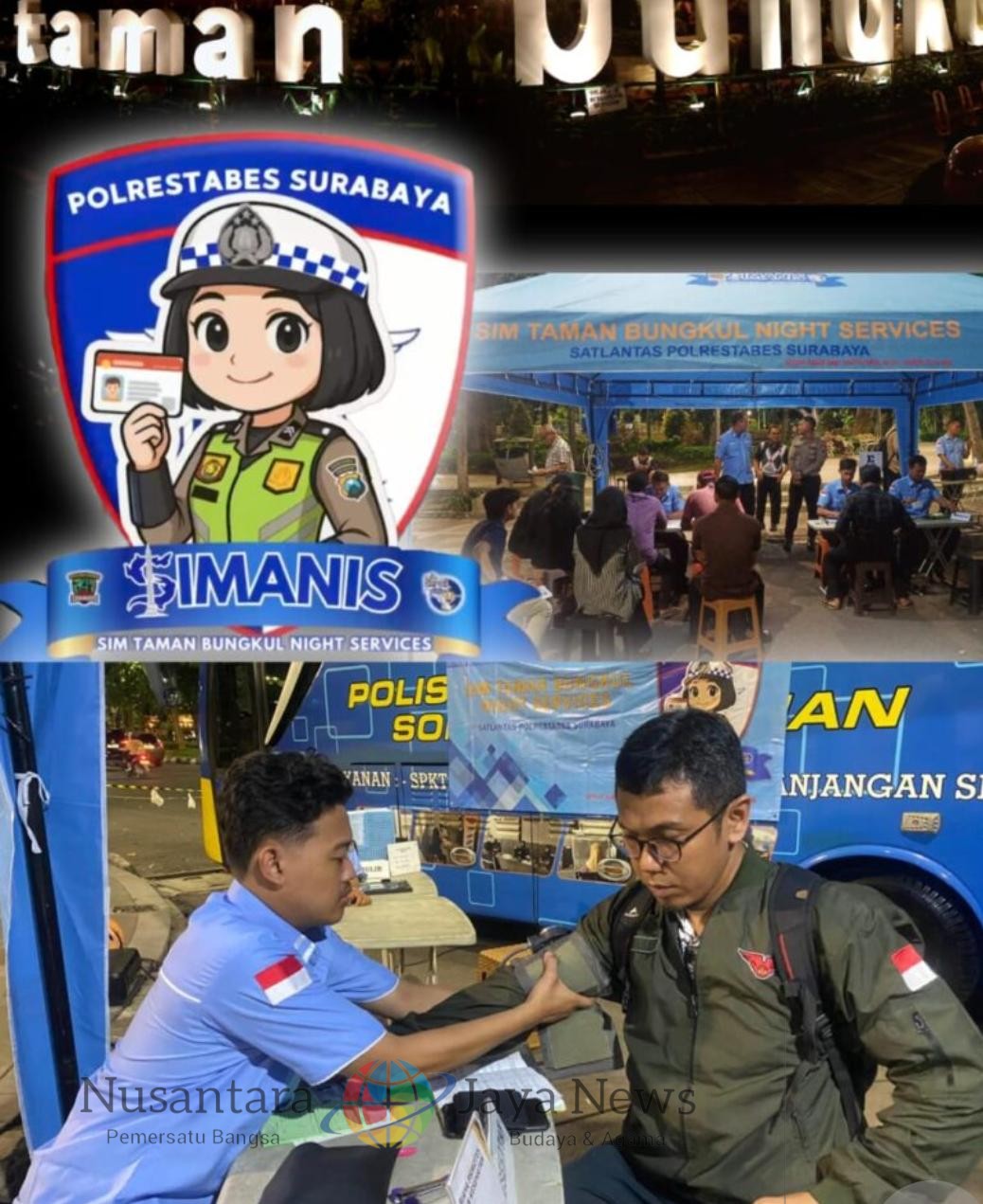 Surabaya |Nusantara Jaya News – Satuan Lalu Lintas (Satlantas) Polrestabes Surabaya terus menghadirkan inovasi layanan publik. Kali ini, masyarakat dapat menikmati kemudahan perpanjangan Surat Izin Mengemudi (SIM) pada malam hari melalui program SIM Taman Bungkul Night Services (SIM Manis).