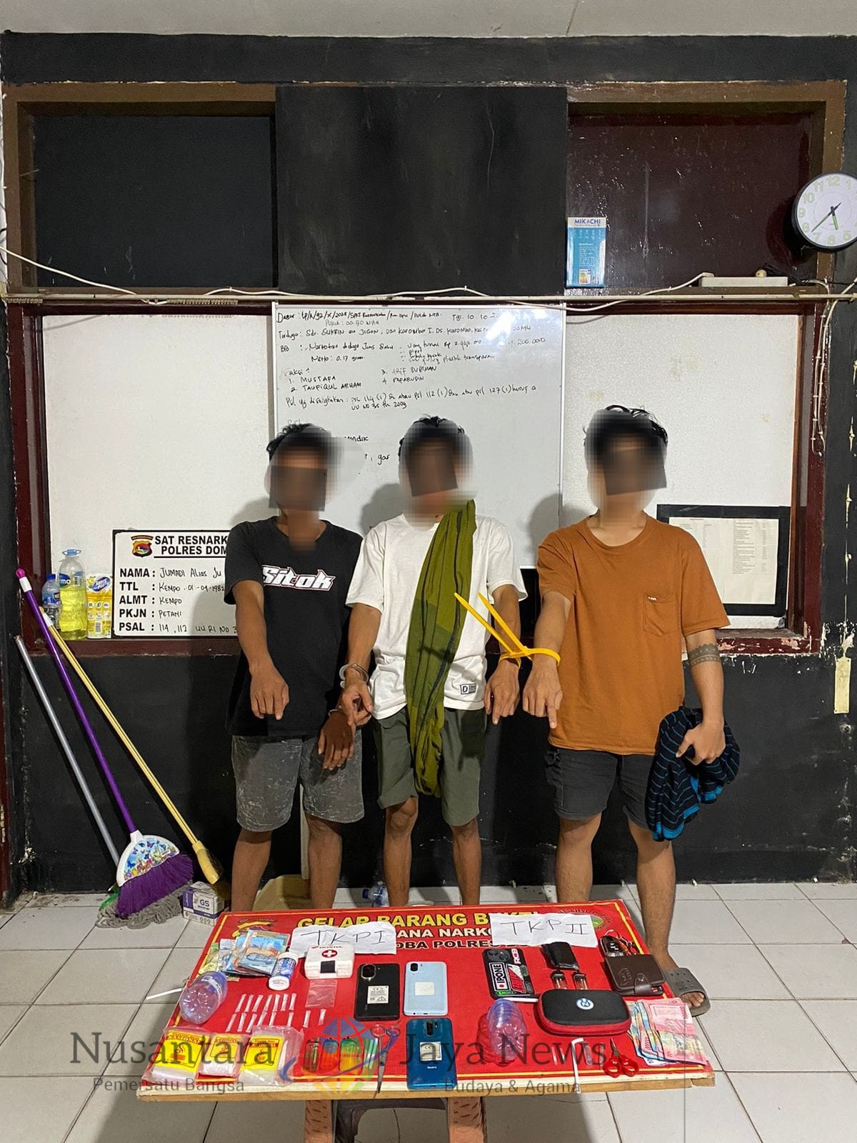 “Di tempat kejadian perkara petugas menemukan 13 poket sabu siap edar, alat hisap (bong), serta uang tunai yang diduga hasil transaksi,” papar Kasat Narkoba Iptu Rahmadun.