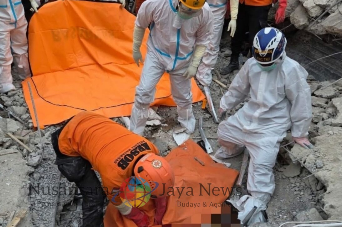 Sidoarjo |Nusantara Jaya News – Upaya pencarian korban ambruknya bangunan musala Pondok Pesantren (Ponpes) Al Khoziny di Kabupaten Sidoarjo terus dilakukan tanpa henti. Hingga Minggu (5/10/2025) dini hari, Tim SAR gabungan kembali mengevakuasi 11 jenazah santri yang ditemukan tertimbun reruntuhan bangunan, menambah jumlah korban meninggal dunia menjadi 37 orang, termasuk satu bagian tubuh yang ditemukan pada siang harinya.