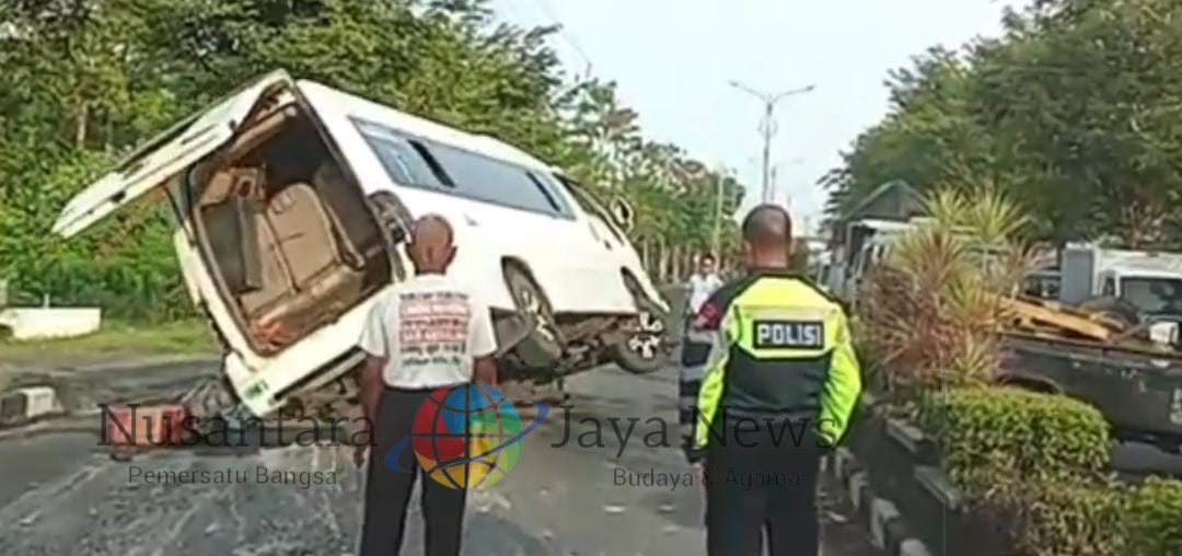 Sebuah minibus Isuzu Elf bernopol DK 7914 AG yang melaju dari arah timur ke barat tiba-tiba hilang kendali dan terguling setelah menabrak median jalan.