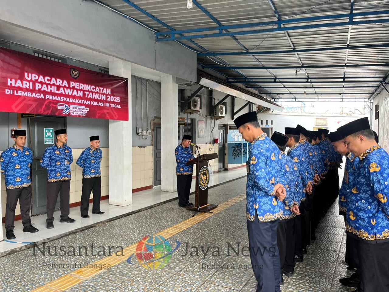 Tegal -l|Nusantara Jaya News – 10 November 2025- Lembaga Pemasyarakatan Kelas IIB Tegal menggelar upacara bendera untuk memperingati Hari Pahlawan 2025. Upacara yang berlangsung khidmat ini dihadiri oleh seluruh jajaran petugas Lapas Tegal. Kegiatan ini bertujuan untuk menanamkan nilai-nilai kepahlawanan, patriotisme, dan semangat perjuangan kemerdekaan kepada seluruh insan Lapas Tegal.