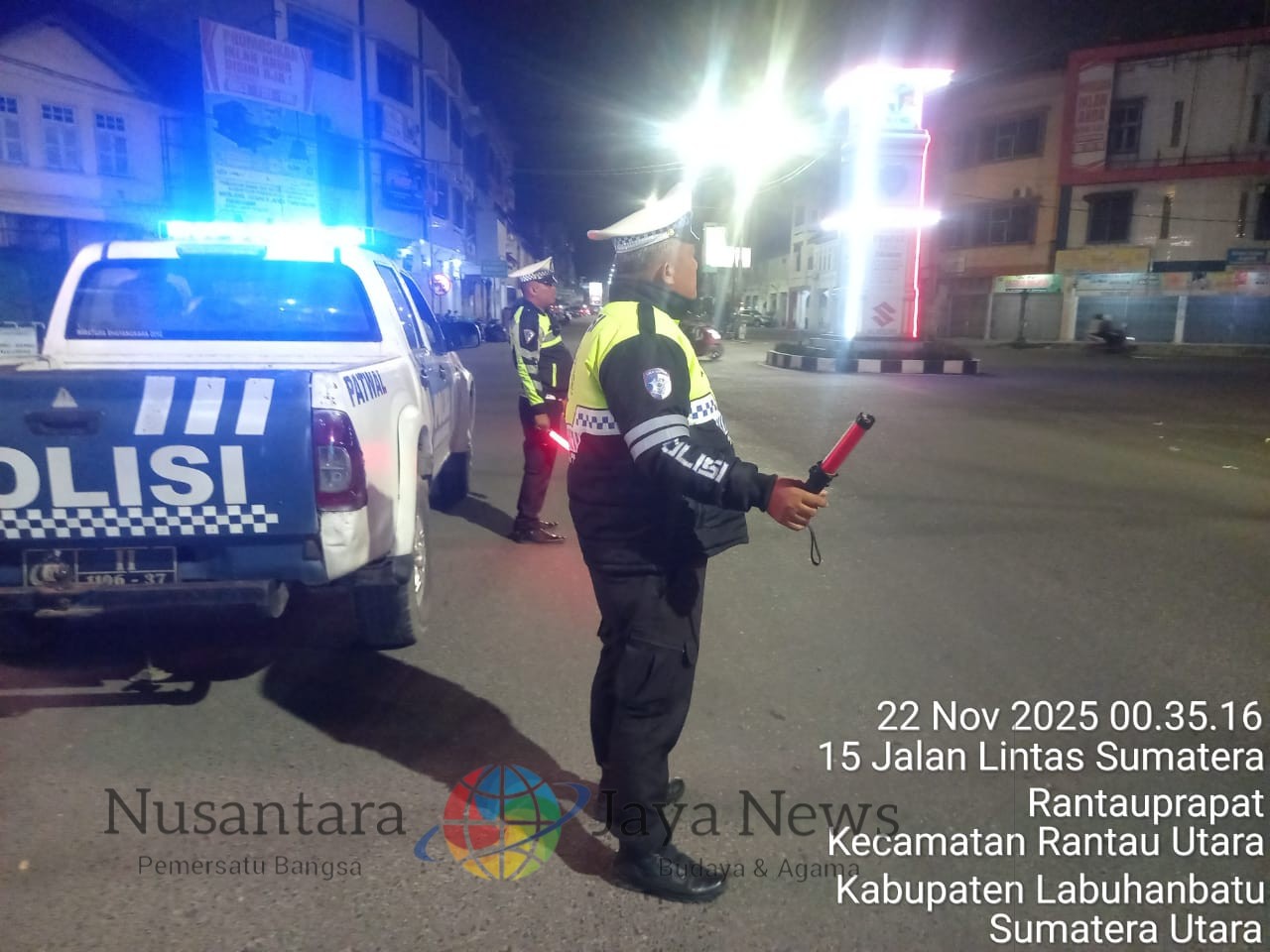 Labuhanbatu|nusantara jaya news – Sat Lantas Polres Labuhanbatu di bawah pimpinan Kasat Lantas IPTU Muhammad Rizal kembali melaksanakan Patroli Blue Light pada Jumat, 21 November 2025, sebagai upaya menjaga keamanan, keselamatan, dan ketertiban lalu lintas pada malam hari. Patroli difokuskan di sepanjang Jalinsum wilayah hukum Polres Labuhanbatu.
