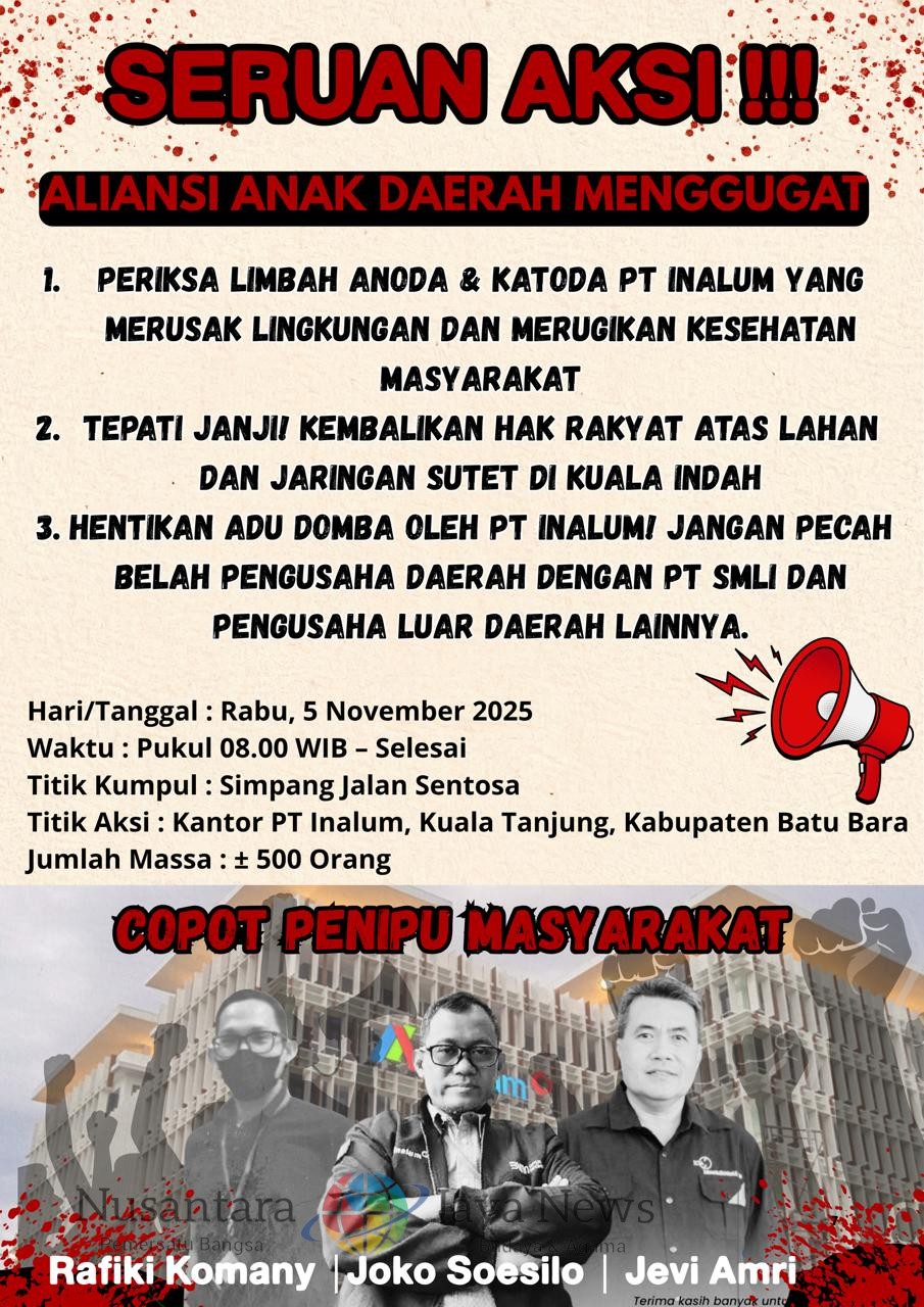 Batubara |Nusantara Jaya News — Aliansi Anak Daerah Menggugat (AADM) akan menggelar aksi unjuk rasa sebagai bentuk protes atas dugaan ketidakadilan terhadap pengusaha lokal dan sejumlah persoalan lingkungan di sekitar wilayah operasional perusahaan di Kantor Direksi PT Indonesia Asahan Aluminium (Inalum), Kuala Tanjung, pada Rabu (5/11).