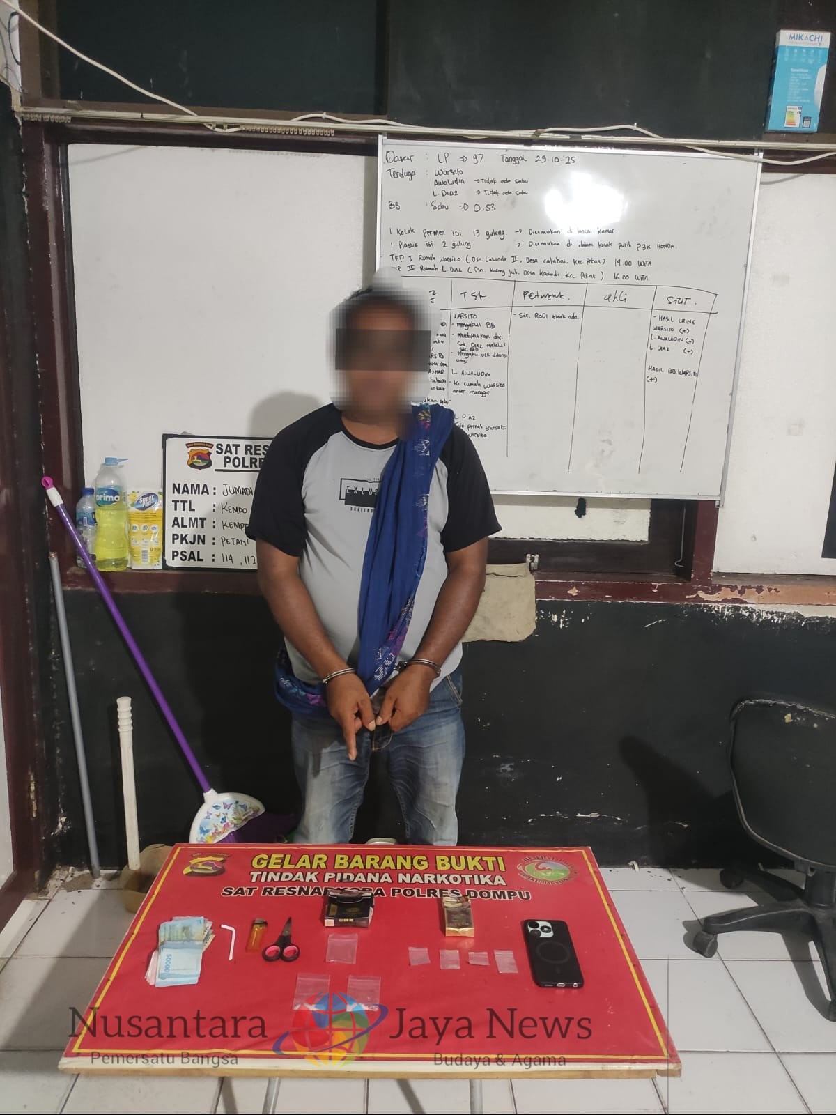 Tim Satresnarkoba berhasil mengamankan seorang pria berinisial A (43) di Dusun Pancasila, Desa Tambora, Kecamatan Pekat, Kabupaten Dompu, yang diduga kuat sebagai pengedar narkotika jenis sabu.