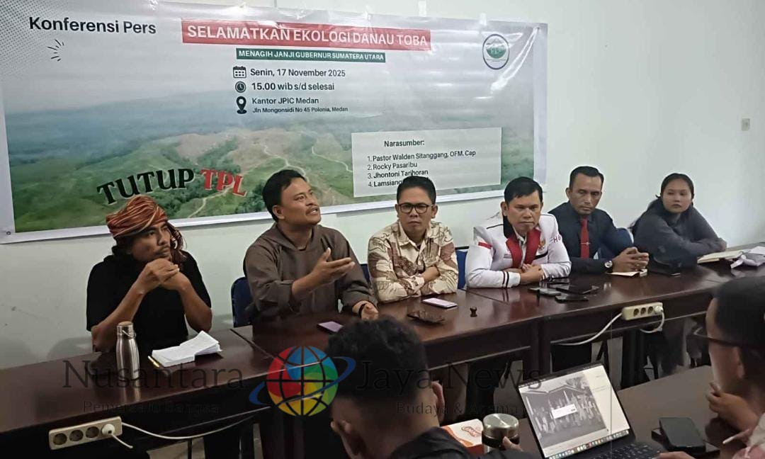 Nusantarajayanews|medan,— Satu pekan setelah aksi besar-besaran menuntut penutupan PT Toba Pulp Lestari (TPL) pada Senin, 10 November 2025, Sekber Gerakan Oikumenis untuk Keadilan Ekologis Sumut kembali bersuara. Melalui konferensi pers di Kantor JPIC Jalan Monginsidi Medan, Senin sore (17/11/2025), mereka menegaskan bahwa janji Gubernur Sumatera Utara, Bobby Nasution, tidak boleh berhenti pada pernyataan di media.