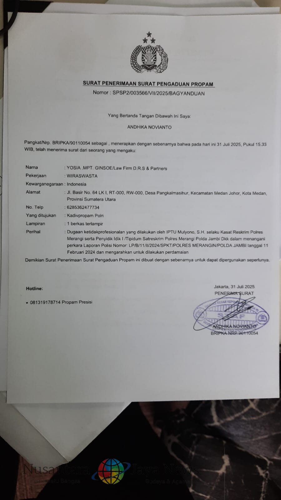 Kedatangan Daud ke Propam untuk melaporkan atas Dugaan ketidakprofesionalan Iptu mulyono,S.H selaku penyidik Polres Merangi serta penyidik 1/Tipidum Polda Jambi Satres Polres Merangi Polda Jambi dalam menangani Laporan Polisi Nomor: LP/B/11/II/2024/SPKT/POLRES MERANGIN/POLDA JAMBI tanggal 11 Februari 2024 dan mengarahkan untuk dilakukan perdamaian Demikian Surat Penerimaan Surat Pengaduan Propam ini dibuat dengan sebenarnya untuk dapat dipergunakan seperlunya.