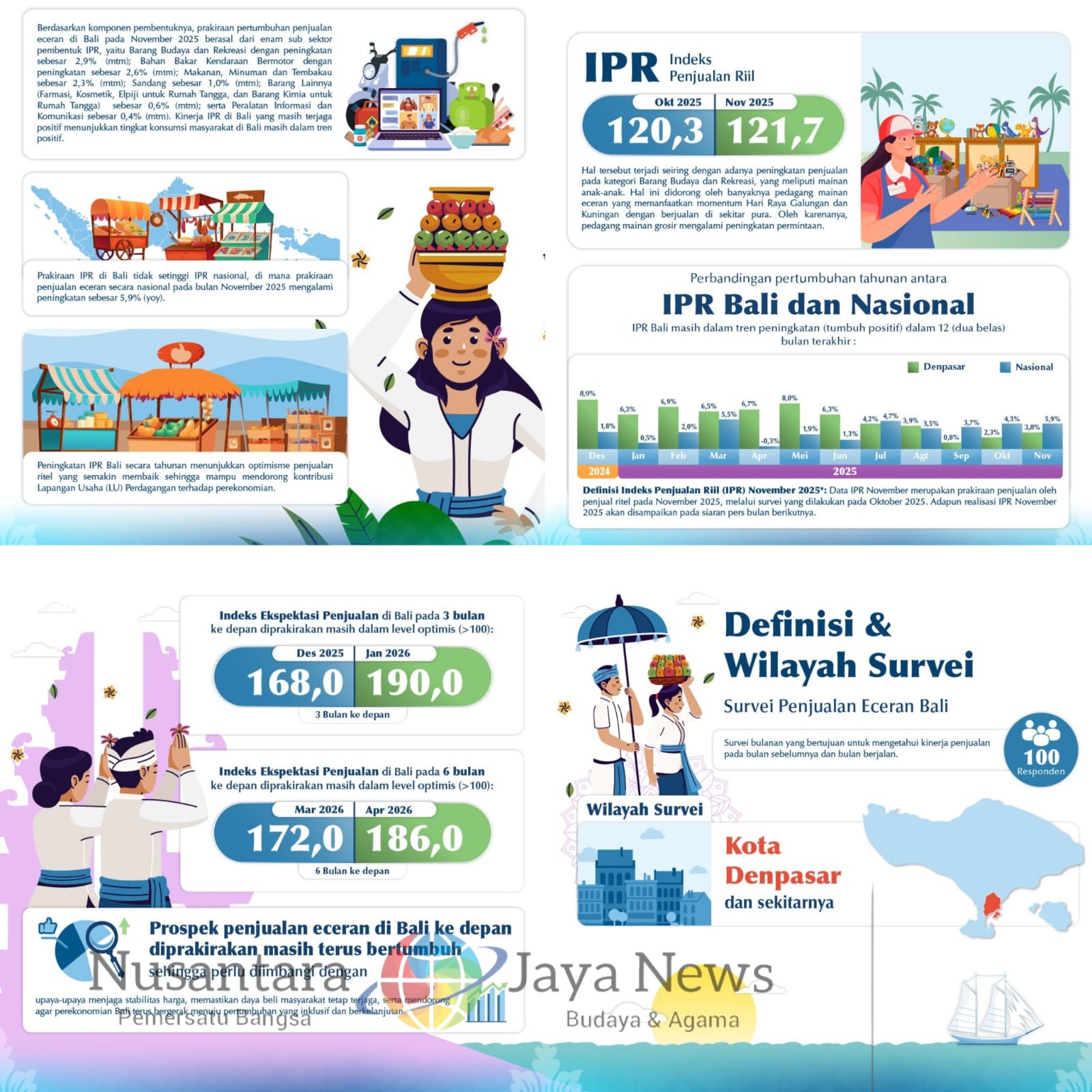 Denpasar |Nusantara Jaya News — Kinerja penjualan eceran di Provinsi Bali pada November 2025 diprakirakan menunjukkan tren peningkatan yang solid. Hal tersebut tercermin dari Indeks Penjualan Riil (IPR) Bali yang mencapai 121,7 atau secara tahunan tumbuh sebesar 3,8 persen (year on year/yoy). Capaian ini menegaskan bahwa aktivitas penjualan ritel di Bali masih berada pada level optimis, ditunjukkan dengan indeks di atas angka 100.