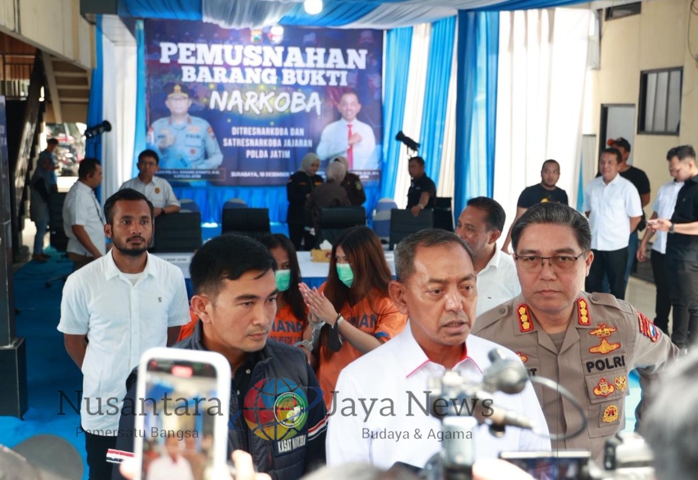 Surabaya |Nusantara Jaya News – Polda Jawa Timur kembali menegaskan komitmennya dalam memerangi peredaran gelap narkotika. Sikap tegas tersebut disampaikan melalui konferensi pers pemusnahan barang bukti narkoba yang dirangkaikan dengan pemaparan capaian pengungkapan kasus narkotika sepanjang tahun anggaran 2025, Kamis (18/12/2025).