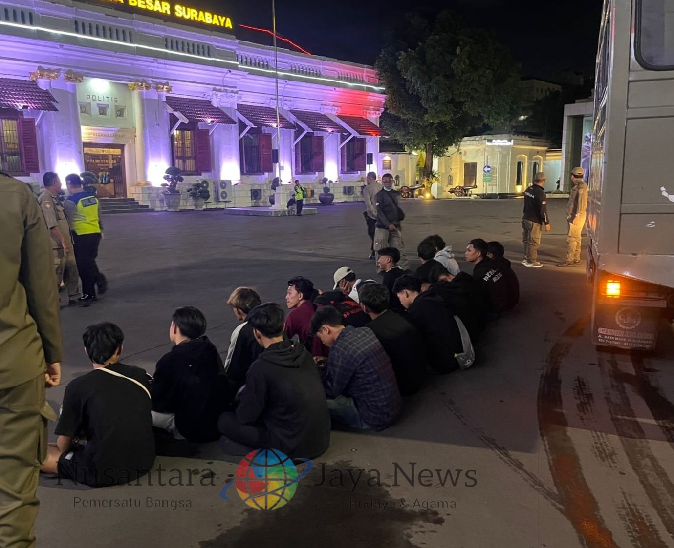 Surabaya |Nusantara Jaya News — Satuan Samapta Polrestabes Surabaya mengamankan 18 pemuda yang diduga terlibat perkelahian antar kelompok perguruan silat di Jalan Kedungdoro, Surabaya, Kamis (15/1/2026) sekitar pukul 00.30 WIB. Dalam penindakan tersebut, polisi juga mengamankan 10 unit sepeda motor, serta sejumlah batu dan kayu yang diduga digunakan sebagai alat perkelahian.
