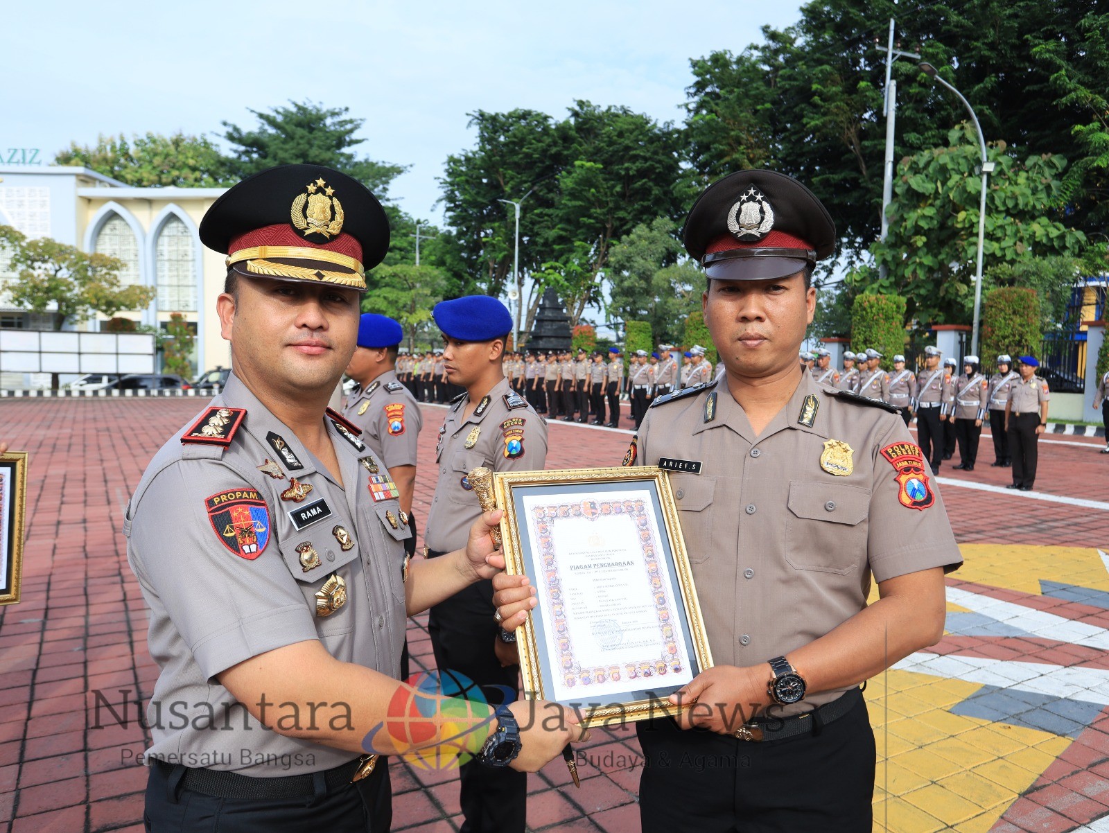 GRESIK -l|Nusantara Jaya News — Kepolisian Resor (Polres) Gresik menggelar upacara pemberian penghargaan serta penyerahan tanda kehormatan kepada personel berprestasi di halaman Mapolres Gresik, Senin (26/1/2026) pagi.