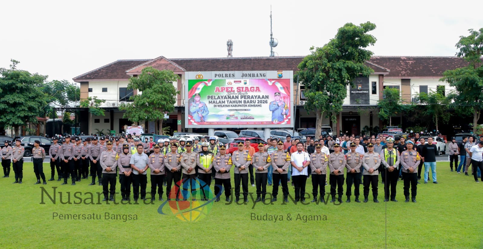 Jombang Nusantara Jaya News – Ratusan personel Polres Jombang disiagakan dalam rangka Pelayanan Pengamanan Malam Tahun Baru 2026, guna memastikan situasi keamanan dan ketertiban masyarakat tetap aman dan kondusif. Kesiapan tersebut ditandai dengan pelaksanaan Apel Pelayanan Pengamanan yang dipimpin langsung oleh Kapolres Jombang, AKBP Ardi Kurniawan, S.H., S.I.K., CPHR, dan diikuti oleh personel Polres Jombang serta Polsek jajaran yang terlibat dalam pengamanan perayaan pergantian tahun di wilayah Kabupaten Jombang.