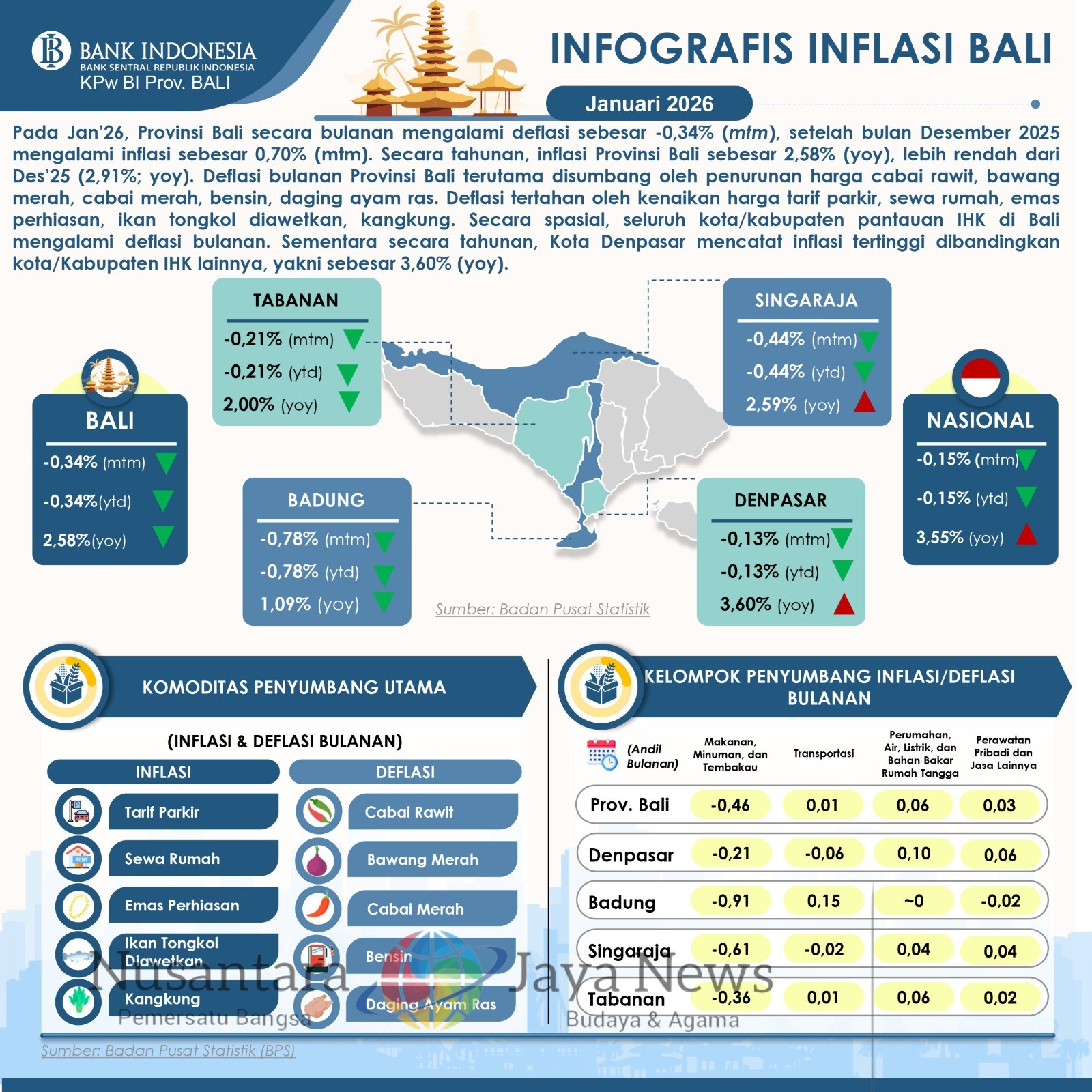 Bali |Nusantara Jaya News — Perkembangan inflasi Provinsi Bali pada rilis BPS Provinsi Bali tanggal 2 Februari 2026 mencatatkan bahwa secara