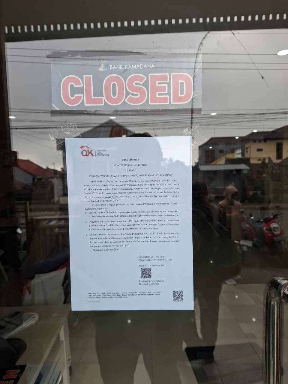 Denpasar |Nusantara Jaya News – Otoritas Jasa Keuangan (OJK) sesuai dengan Keputusan Anggota Dewan Komisioner OJK Nomor KEP-14/D.03/2026 tanggal 18 Februari 2026 tentang Pencabutan Izin Usaha PT Bank Perekonomian Rakyat (BPR) Kamadana, mencabut izin usaha PT BPR Kamadana yang beralamat di Jalan Raya Batur Kintamani, Batur Utara, Kintamani, Kabupaten Bangli, Provinsi Bali.