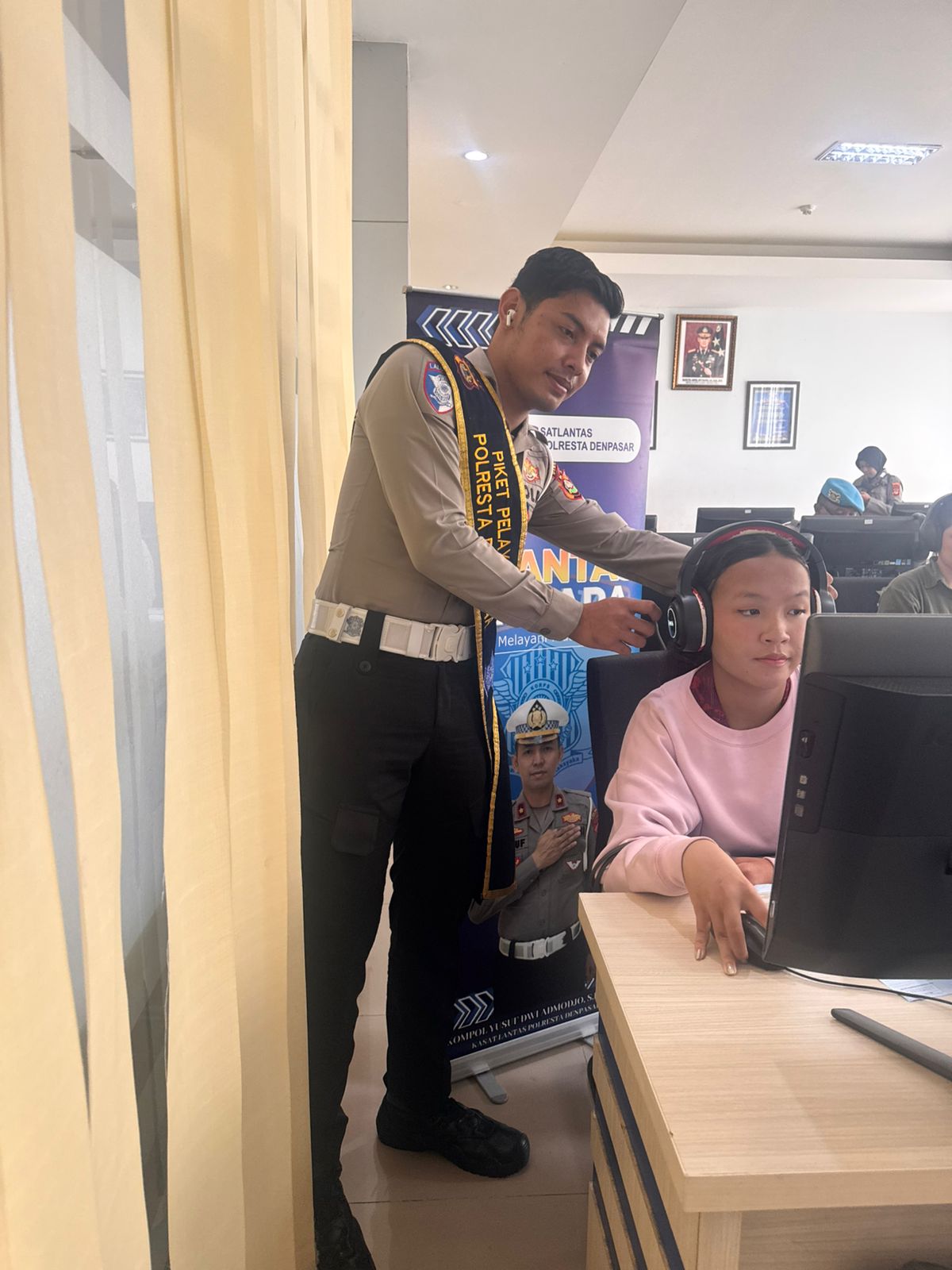 Denpasar |Nusantara Jaya News – Pelayanan di Satpas SIM Polresta Denpasar terus menunjukkan komitmennya dalam memberikan layanan prima, cepat, dan humanis kepada masyarakat. Salah satunya terlihat saat petugas secara aktif mendampingi pemohon SIM yang mengikuti ujian teori berbasis komputer.