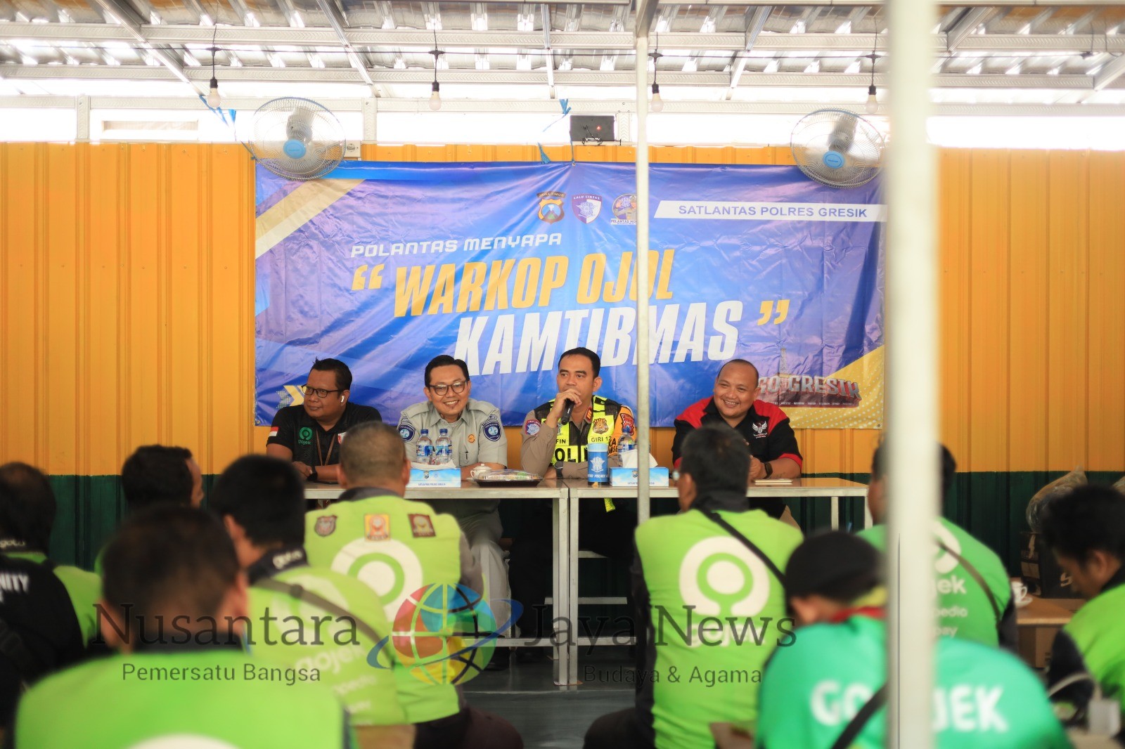 GRESIK |Nusantara Jaya News – Suasana santai namun penuh muatan edukatif di Warkop Exceed Underpass GKB, Kabupaten Gresik, Selasa pagi (10/2/2026). Di balik secangkir kopi, Satuan Lalu Lintas (Satlantas) Polres Gresik menggelar inovasi pendekatan humanis bertajuk “Polantas Menyapa” melalui program Ojol Kamtibmas, yang merupakan bagian dari Operasi Keselamatan Semeru 2026.