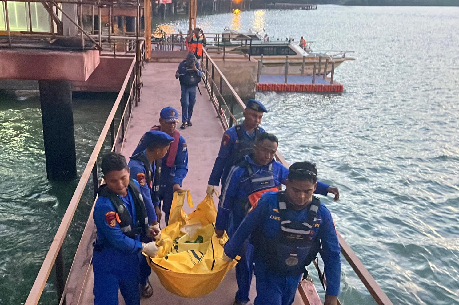 Evakuasi jasad korban berhasil diangkat dari perairan dan dibawa ke dermaga untuk pemeriksaan awal.