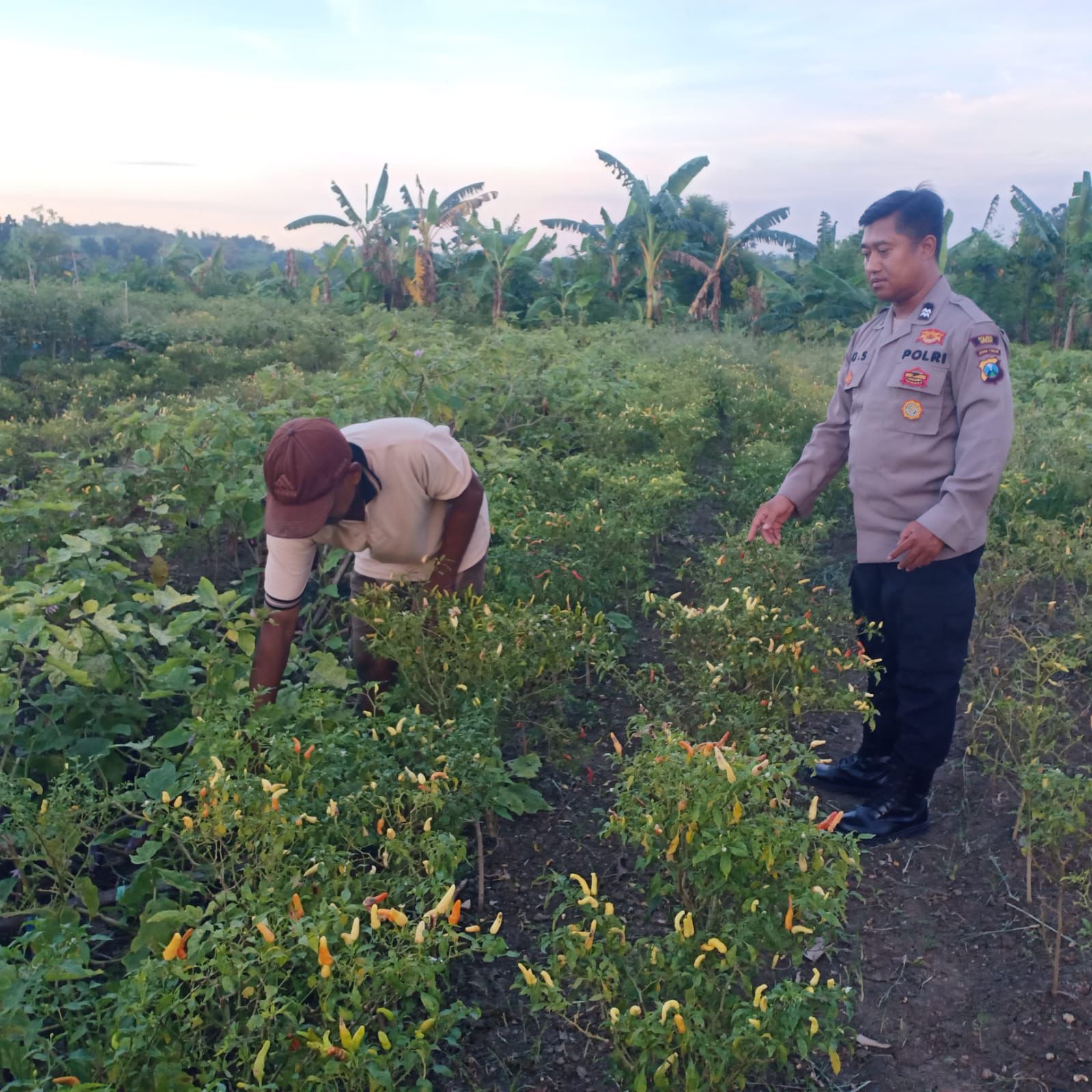 Bersama pemilik lahan tanaman Cabe, Bhabinkamtibmas Desa Sidoraharjo memberikan penjelasan terkait program ketahanan pangan bidang pekarangan pangan bergizi yang bertujuan untuk membantu memberikan suplai kepada SPPG.