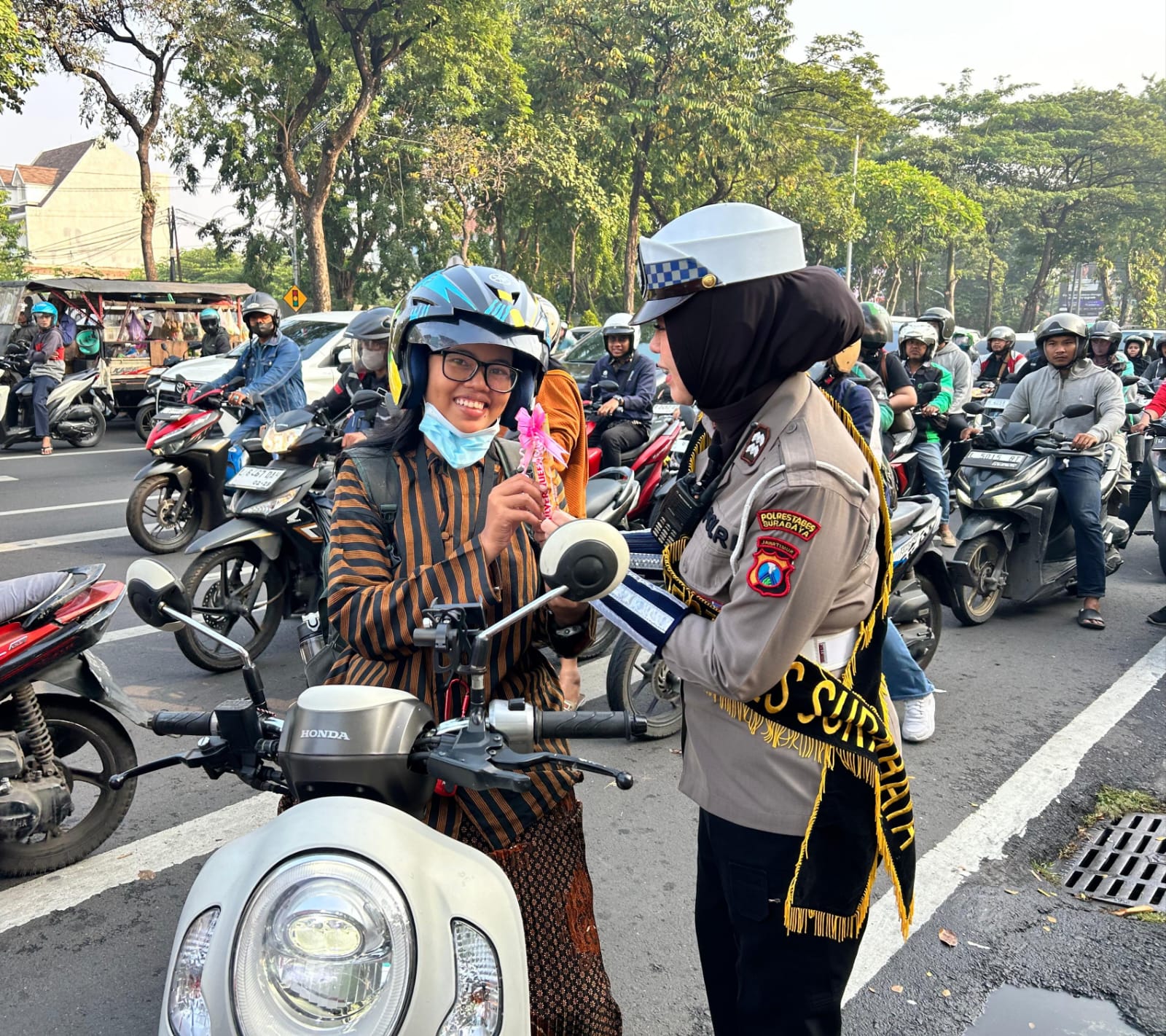 “Kami harapkan kita sebagai perempuan bisa saling support kepada seluruh pekerja perempuan, maka dalam rangka Hari Kartini kita berikan apresiasi setinggi tingginya dengan memberikan coklat dan helm kepada pengguna kendaraan bermotor perempuan”- tutur AKP Santa, Kanit Kamsel Satlantas Polrestabes Surabaya. (Hadi)