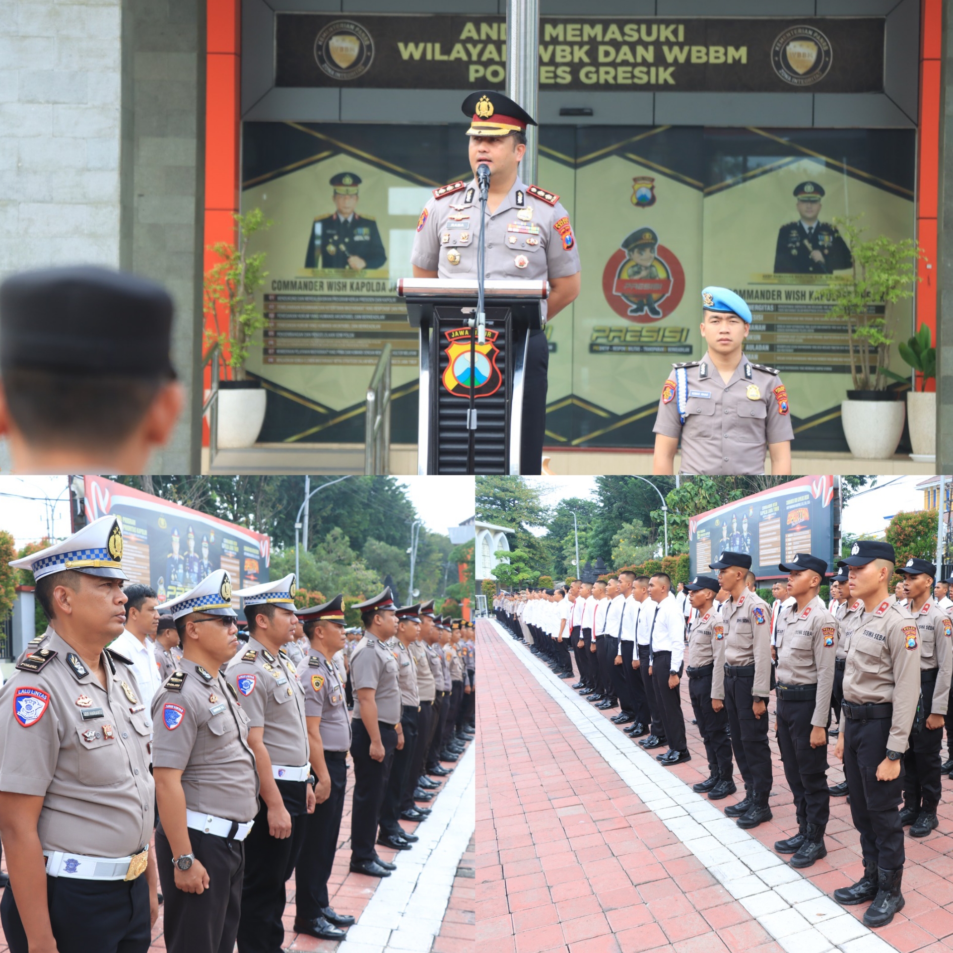 Apel tersebut dihadiri Wakapolres Gresik Kompol Shabda Purusha Putra, jajaran Pejabat Utama (PJU), Kapolsek, personel Bintara, ASN Polri, serta siswa Latja Brimob SPN Polda Jawa Timur.