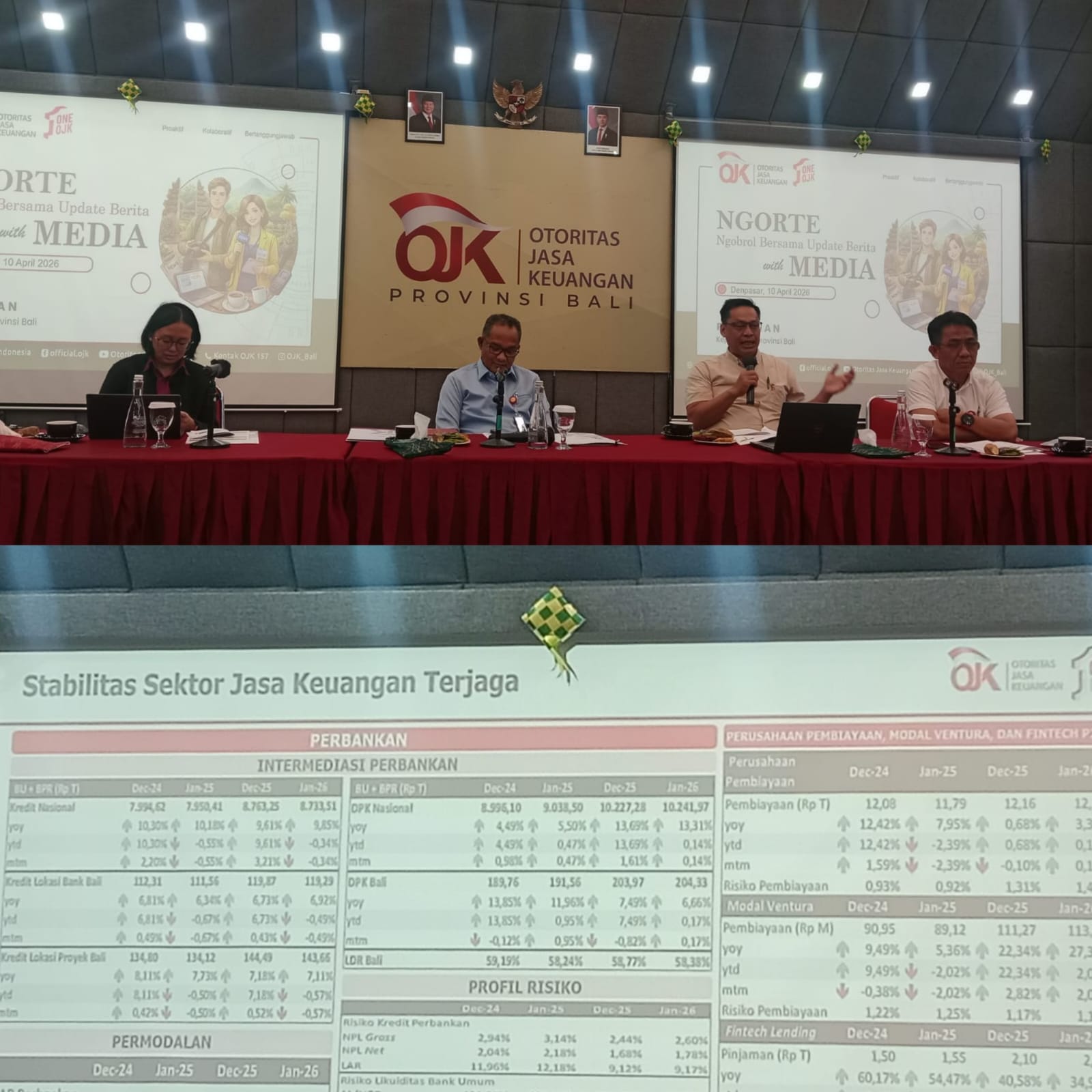 Demikian disampaikan OJK dalam acara Ngorte (Ngobrol Update Berita) bersama media, jumat (10/4/2026) di kantor OJK Bali dengan narasumber pimpinan OJK Bali diantaranya, Kepala OJK Bali, Parjiman, Kepala Direktorat Pengawasan Perilaku Pelaku Usaha Jasa Keuangan, Edukasi, Pelindungan Konsuman dan Layanan Manajemen Strategis OJK Provinsi Bali, Irhamsah, Kepala Divisi Pengawasan Lembaga Jasa Keuangan 3 OJK Provinsi Bali, Ni Made Novi Susilowati dan Kepala Divisi Pengawasan Lembaga Jasa Keuangan 4 OJK Provinsi Bali, Zulkifli.