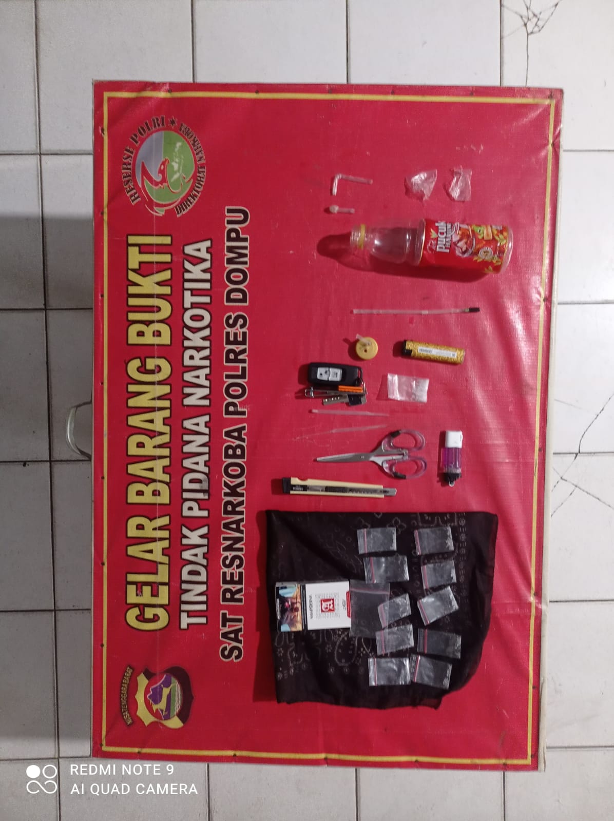 Dari hasil penggeledahan yang disaksikan oleh dua orang saksi umum, petugas berhasil mengamankan barang bukti narkotika jenis sabu dengan berat bruto 3,32 gram, 10 klip berisi sabu dalam bungkus rokok, 1 klip sabu tambahan. Selain itu ada alat hisap (bong) dan pipet modifikasi, korek api modifikasi dan korek gas, serta gunting dan kater, Sapu tangan maupun 1 unit sepeda motor Honda PCX warna merah tanpa nopol dan